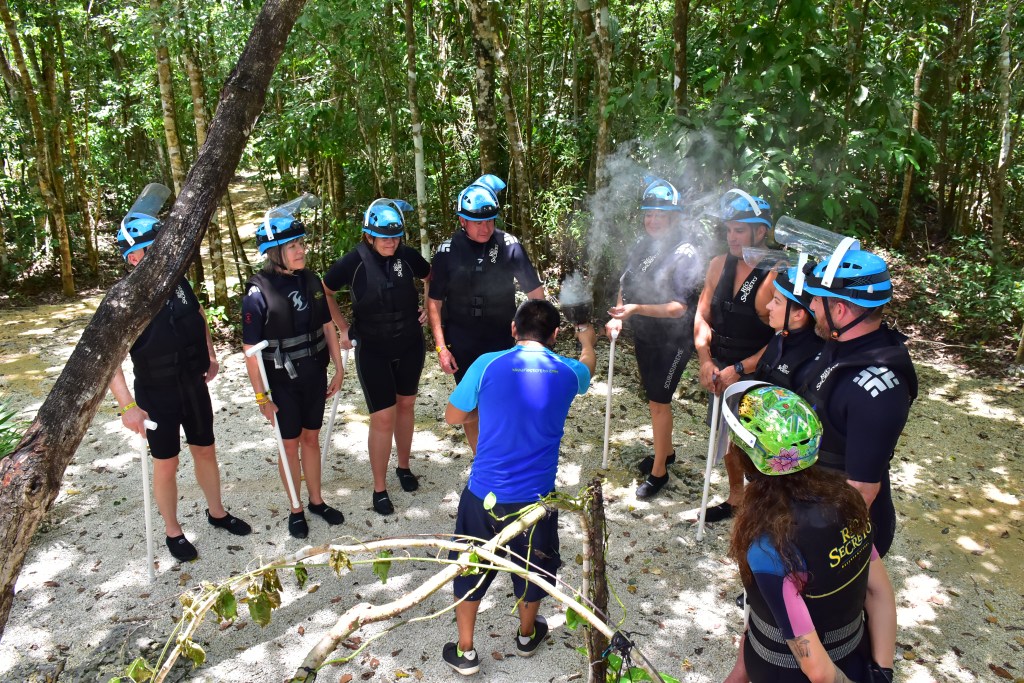 We were picked up at our hotel by the tour company and drove south of Playa del Carmen eventually turning off into the jungle. For another 20 minutes we traveled on dirt roads through dense jungle until we arrived at a small complex set up with lockers and showers. Our guide greeted us and then instructed us to gear up in wet suits, life jackets and helmets.