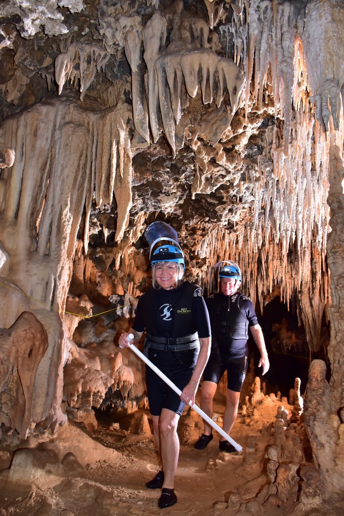 From the dry cave floor, we walked into the low, flowing river. It was exceptionally clear. Through narrow passages and expansive chambers, we carefully stepped around outcrops of rock and crevices. Using PVC walking sticks to assess the ground ahead of us, we became aware of holes and different depths of the water. Many times, the guide and her assistant helped us with our footing.