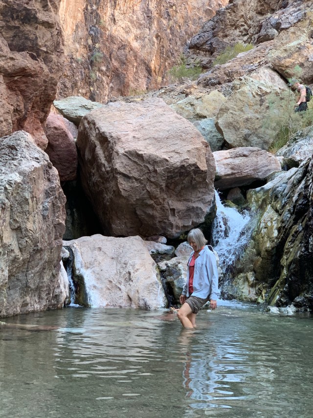 A sense of solitude surrounded us. Our voices were the only sound that broke the silence. We wondered if other hikers were on the trail. There had been cars parked at the trailhead, but we saw no one. As we meandered further into the canyon, two guys eventually appeared, walking out. We were surprised. It was mid-morning, yet they were leaving. Greeting them, I asked if they had, in fact, been to the hot springs. They had. Did they have any advice or tips for us? They nodded empathically. Keep to the far right on the trail. They had come across a rattlesnake on the left side.