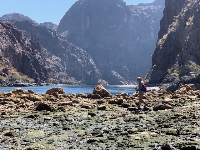 After our break, we continued further along the canyon and finally came out at the Colorado River. The views were spectacular. The walls of the Black Canyon rose high above us. A bright blue sky was in stark contrast against the dark canyon. We saw the soaring arch of the Mike O’Callaghan – Pat Tillman Memorial Bridge, spanning the chasm. Another hot water pool formed by the river, and a few hikers were enjoying its relaxing warmth.