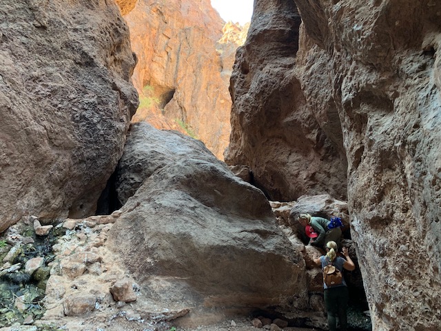 Snakes, lizards, bighorn sheep, and ravens are just a few animals occasionally seen in the canyon. Considered a “high-traffic” trail on the Park’s website, I felt it was unlikely that any animal would bother us. I was wrong. Our encounter with the rattlesnake shook us up, but we were surprised later when a raven suddenly took flight above us and dropped a stone close to our heads. Could it be that these animals, used to their undisturbed environment all summer, weren’t happy to see us?