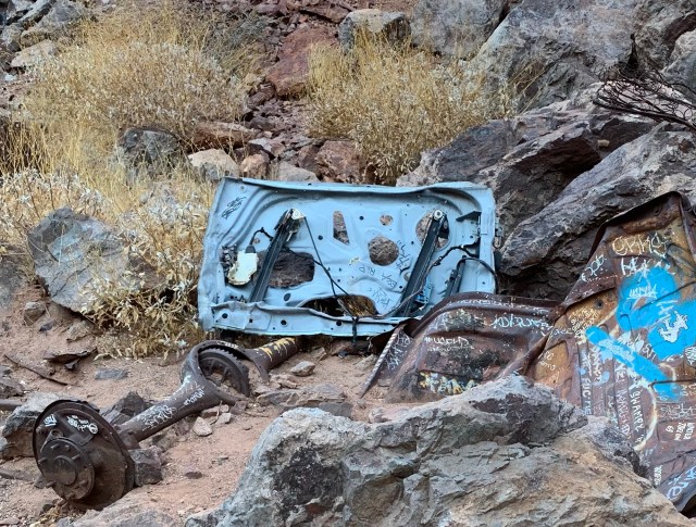 Red sandstone walls surrounded us, marked with deep, black holes large enough for animals and humans to shelter in. I wondered if something was watching us. We pushed forward, exuberate to be out in the fresh air. Chatting along the way, we suddenly grew quiet when we came upon pieces of wreckage. Parts of an old automobile laid along the slope, rusted and scattered. We could only guess what caused the decades old tragedy.
