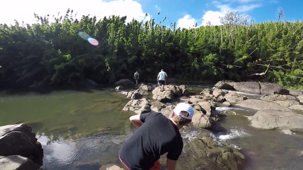 There are four falls on this trail. We hiked to two of them. The Shaka app noted that most injuries on the Road to Hana happen at the last two falls, which have more challenging access. Crossing the river was challenging. Eventually, we had to wade in above our knees to reach the other side. Wet rocks made for slippery footing, and if you weren’t paying attention, a foot could easily get jammed between the rocks.
