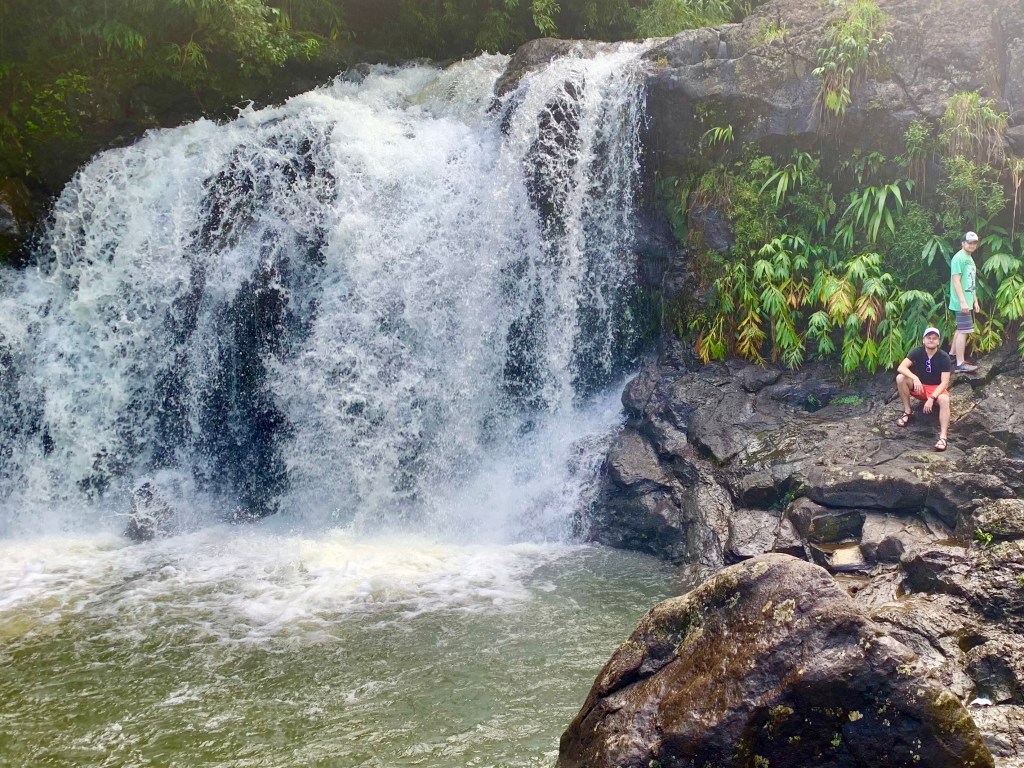 The trail is shaded, and depending on the weather, it can be very muddy. There is a stream to cross. A wooden board has been set down to walk over the water. The trail descends until it ends into a river. We were hesitant in crossing it since it was fairly swift (it had just rained the night before), but several boulders were close enough to each other to gain dry footing. Once we made it across the river, we climbed through more bamboo forests, following the trail again. We walked for about ten minutes and heard running water. The trail turned and paralleled the river. Following it, we came up to a Falls.