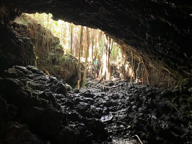 Number 3, explore a lava tube. I wouldn’t have known about this little gem, but the Shaka app suggested it, and we needed to stretch our legs. There wasn’t much room for parking, and we had to dodge cars to cross the road to get to the cave entrance, but once inside, it was worth it. Crouching down, we slipped into a small opening, navigating past tree roots hanging from the ceiling. A large chamber immediately opened before us. Using our lights on our cell phones, we lit up the darkest spots and found our footing. The cave is short and has a massive opening on the opposite end.