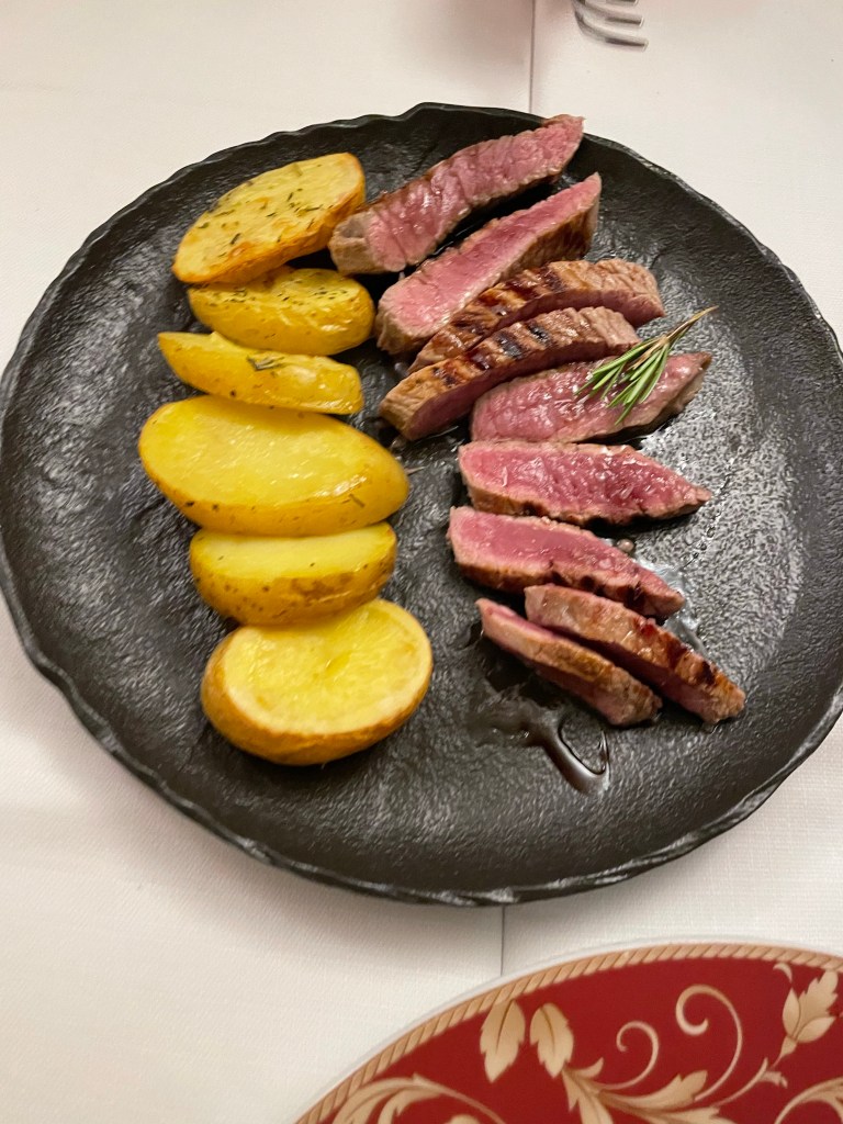 Most of Europe was experiencing a heat wave and the only room that had an air conditioner was the wine cellar. We were very appreciative. We started off with a refreshing Aperol Spritz, a popular summer drink in Europe. Then we ordered the Agnolotti al Sugo d’ Arrosto along with the Tagliolini Fatti in Casa al Ragu, the Pork in a creamy sauce, and the Steak filet. The Agnolotti is a traditional Piedmontese staple. It looks like a miniature ravioli. The Agnolotti was stuffed with meat. Lightly roasted meat juice was drizzled over the pasta.