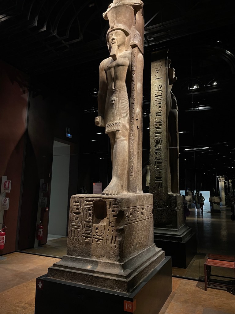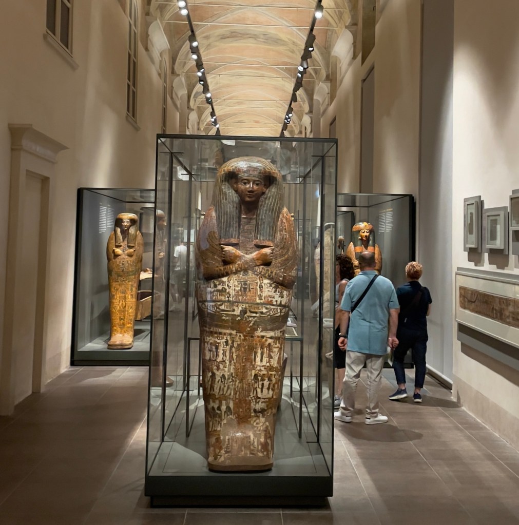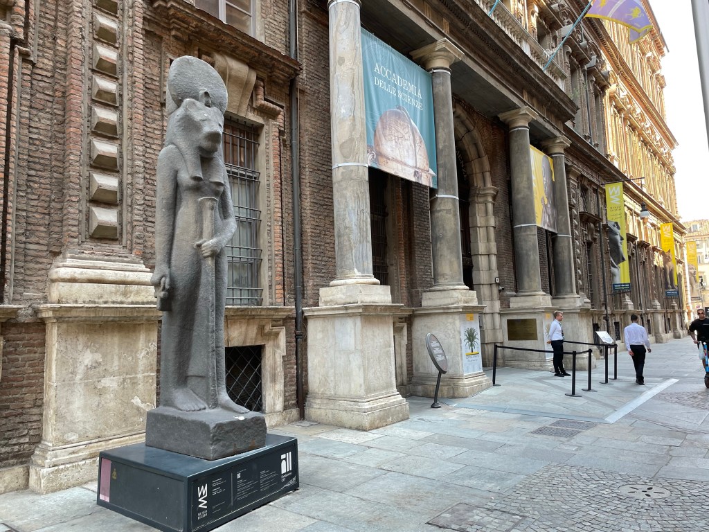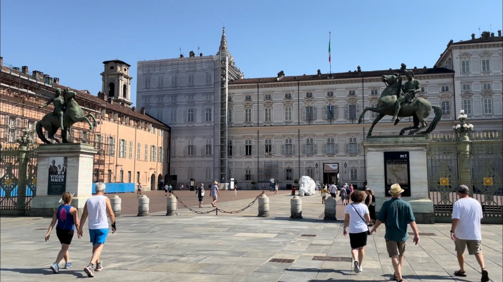We left our husbands and made our way through town, walking past businesses yet to open for the day. Passing through the spacious Piazza San Carlo, we found the museum one block over to the right. When we got up to the ticket window, the attendant waved off our concerns about limited times. Our tickets were good for all day. So real-time information seemed to be at odds with information over the internet. The requirement for masks noted on the museum’s website was no longer enforced.
