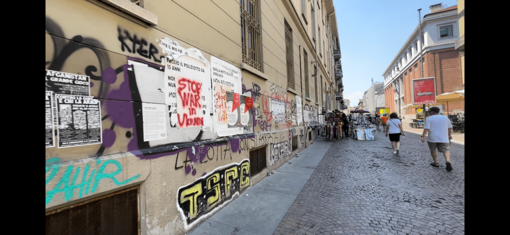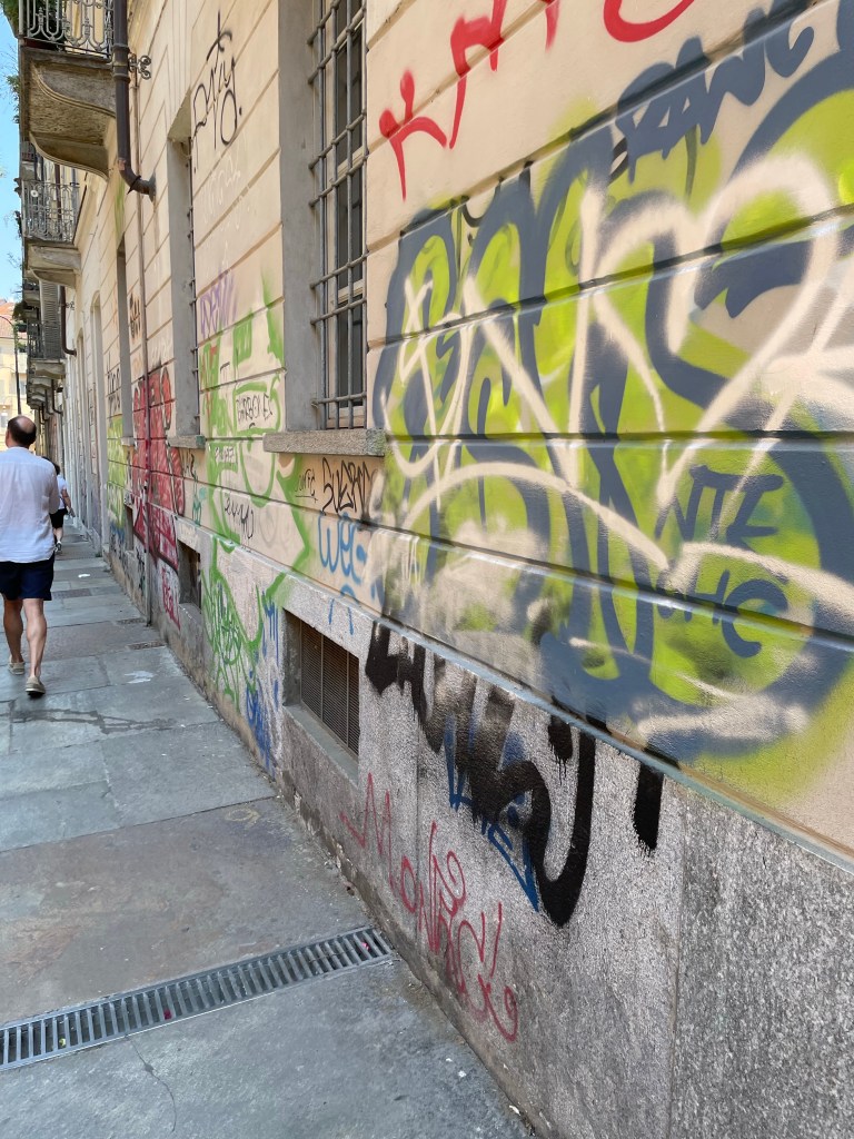On the third day, we headed out of Turin in a rented car. With Maps open on his cell phone, Dave navigated the narrow roads of downtown Turin and merged onto a four-lane highway. I watched out the window as we passed a group of abandoned buildings and a monorail that were once used for the 2006 Winter Olympics. The structures had an eerie presence as they stood abandoned, vines growing on them. I couldn’t help but recollect that this wasn’t the first time that I had seen signs of neglect. Parts of downtown Turin had frequent stretches of graffiti-marked buildings. We were baffled by this display of vandalism. It didn’t make sense as I watched shopkeepers wash down the sidewalks in front of their shops and women watering flower beds. They appeared proud of their city. Active caretakers of public property. Why was this city facing such abuse?