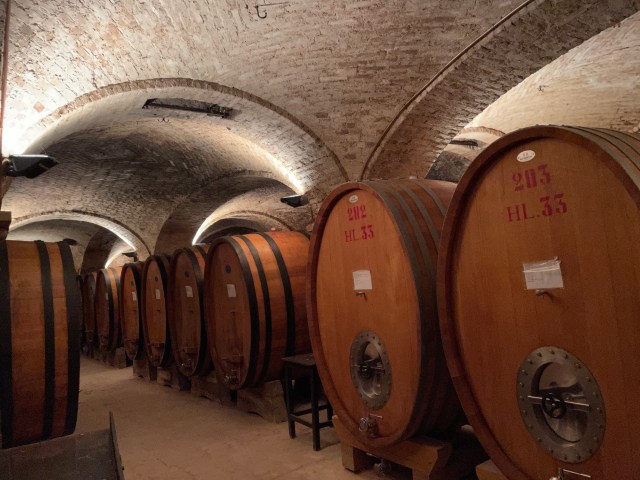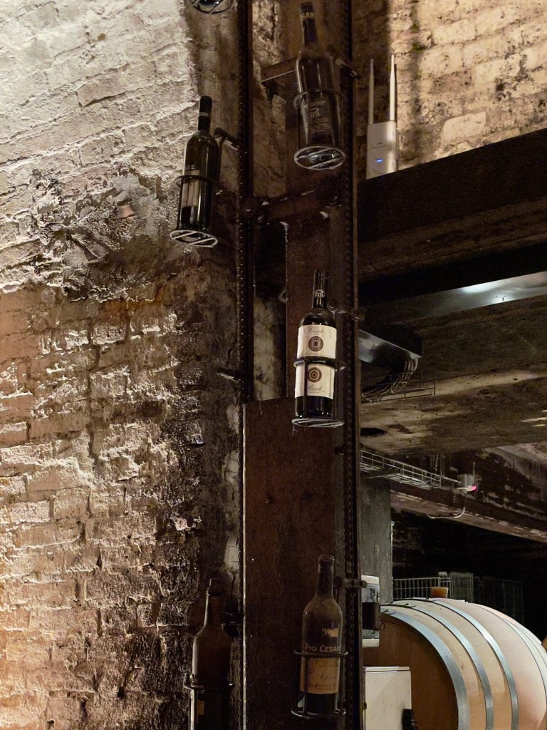 Further along the tunnels, Silvio showed us an old conveyor belt. Wine bottles were once hoisted out of the vaults before elevators were invented. We walked up to a large rack where hundred-year-old bottles sat revealing an age gone by. The labels printed so long ago hadn’t changed that much.