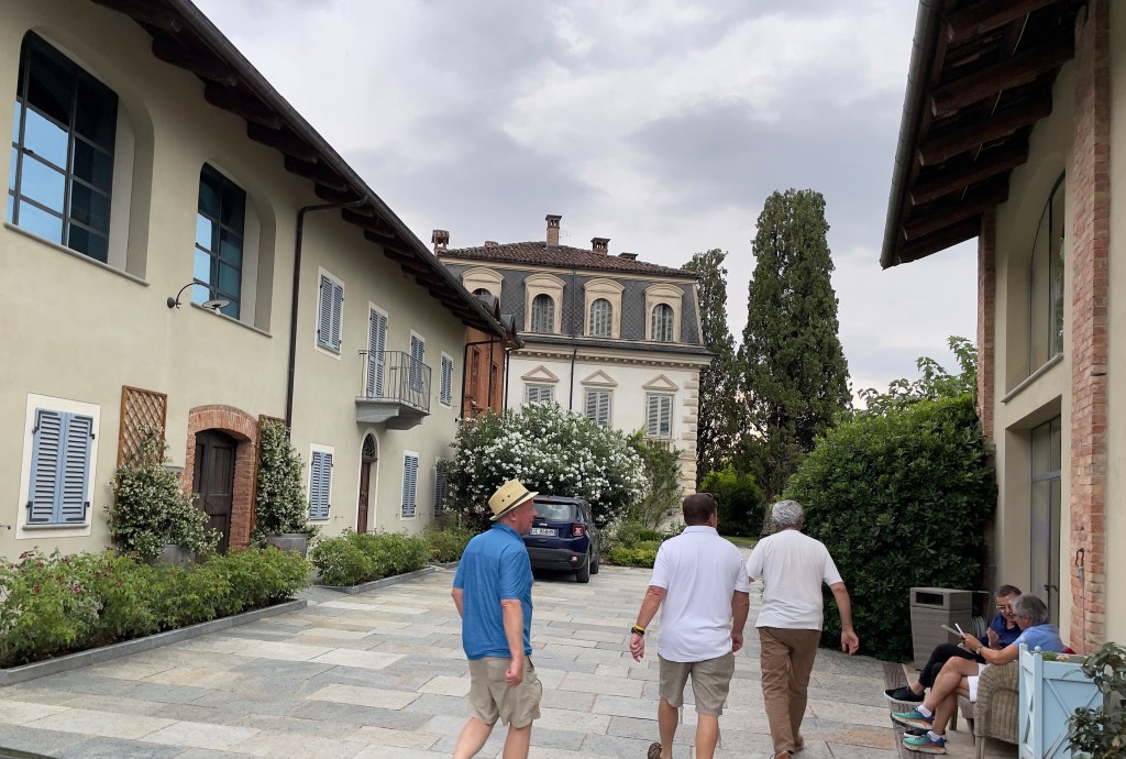Within minutes Lisa and Jim emerged from the building, laughing. I asked, “what was so funny?” Lisa explained the proprietor was hilarious. In expressive, heavily accented English he gestured with his hands, claiming, “You can’t miss the property. There is a sign in large individual letters like HOLLYWOOD with a statue of giant grapes at the entrance!” The letters spelled out Fontanafredda, the winery where the village was located. Of course, we were looking for the name Le Case dei Conti Mirafiore.
