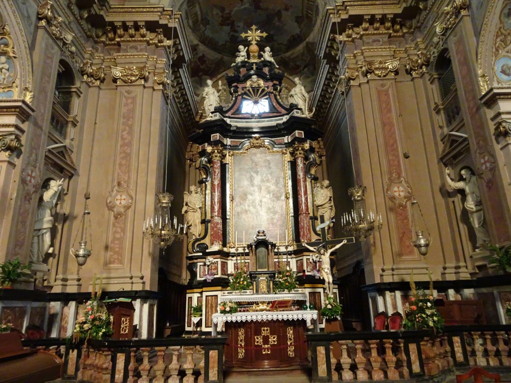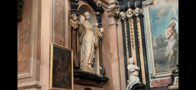 Comparing its humble exterior to its elaborate interior, I was surprised to see such wealth inside the church. Large paintings both framed along the walls and set into the high vaulted ceiling displayed scenes from the bible. Gilded trimmings, statues of angels, and saints made from marble occupied niches and alters along the walls. I noticed a statue of a woman holding a flame in her outstretched hand. She reminded me of the Statue of Liberty in New York City Harbor. Strange. I didn’t recall this person from Christian teachings. Further along the wall, a statue of two men interwinding their arms created Hilter’s swastika. What could it mean? The Knights Templar icon adorned the walls. A yellow cross stood at the altar. It was an odd mix of messages.
