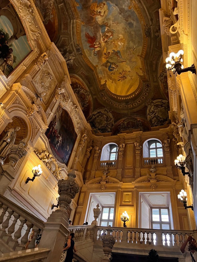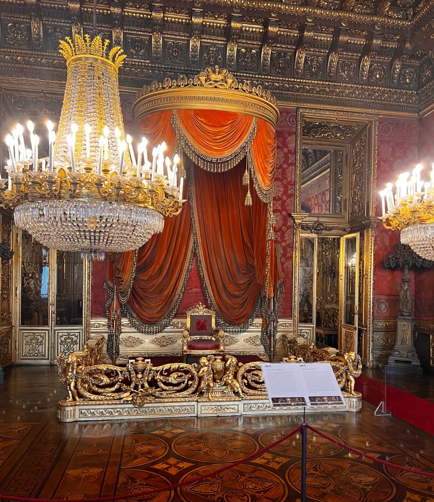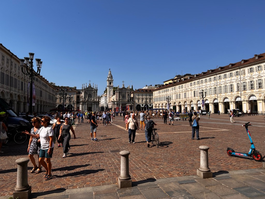 We headed for the Royal Palace of Turin, hoping entry would be easier. The Palace was built for the Dukes of Savoy in the 1600s and once housed the Shroud of Turin. Masks were no longer required but encouraged. Visitors were put into a timed queue to walk through the palace. Only a few visitors were standing in line, so we were able to enter within minutes. I wondered if Sunday was typically a slow day. We proceeded up a grand marble staircase, walking into the first room. The rooms were elaborate, decked out in gold, crystal, and velvet with parquet flooring. Murals were painted on the ceilings, and an armory displayed knights poised on horses. Each room was more breathing-taking than the last. This is an attraction that should be on everyone’s list!