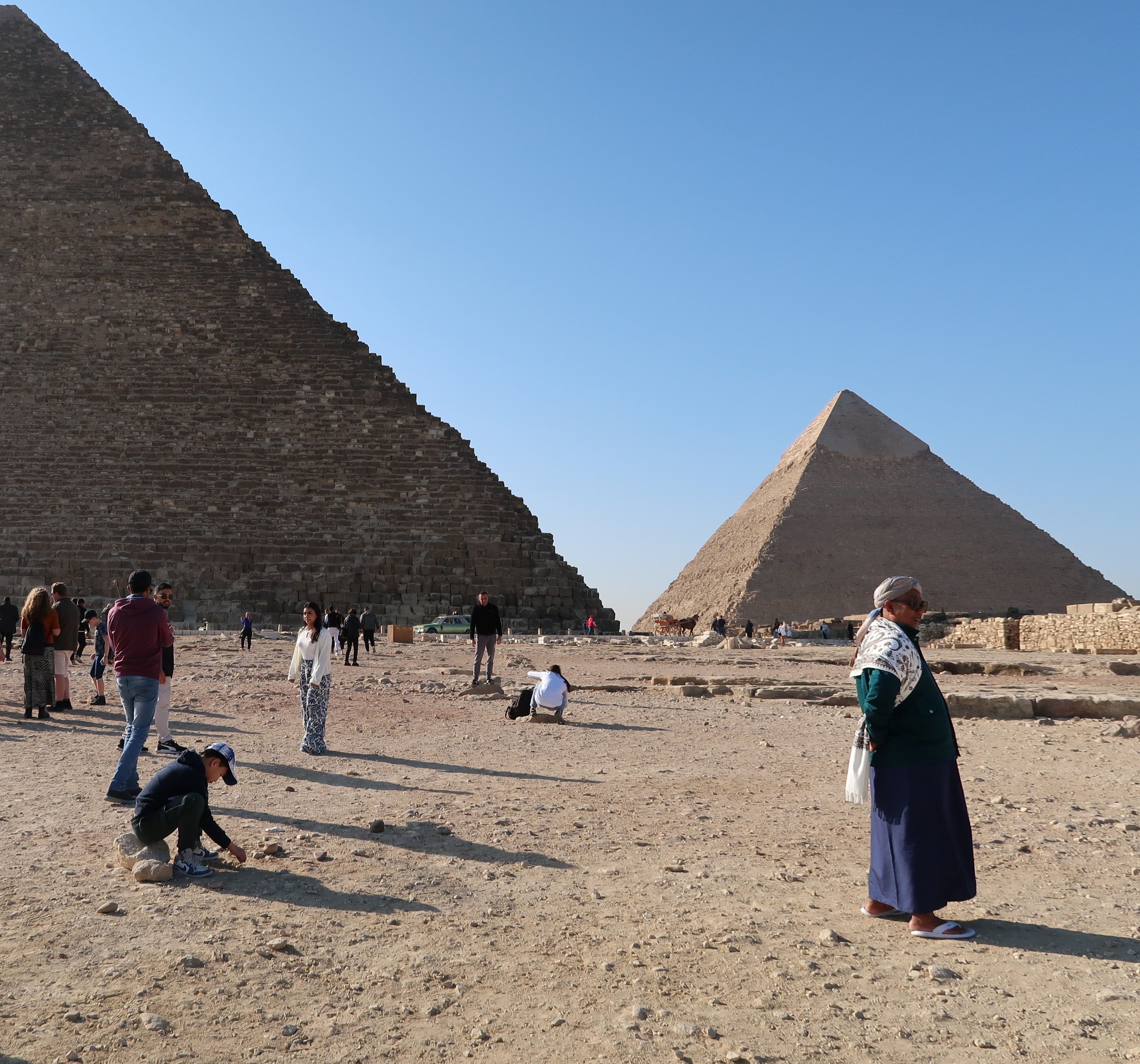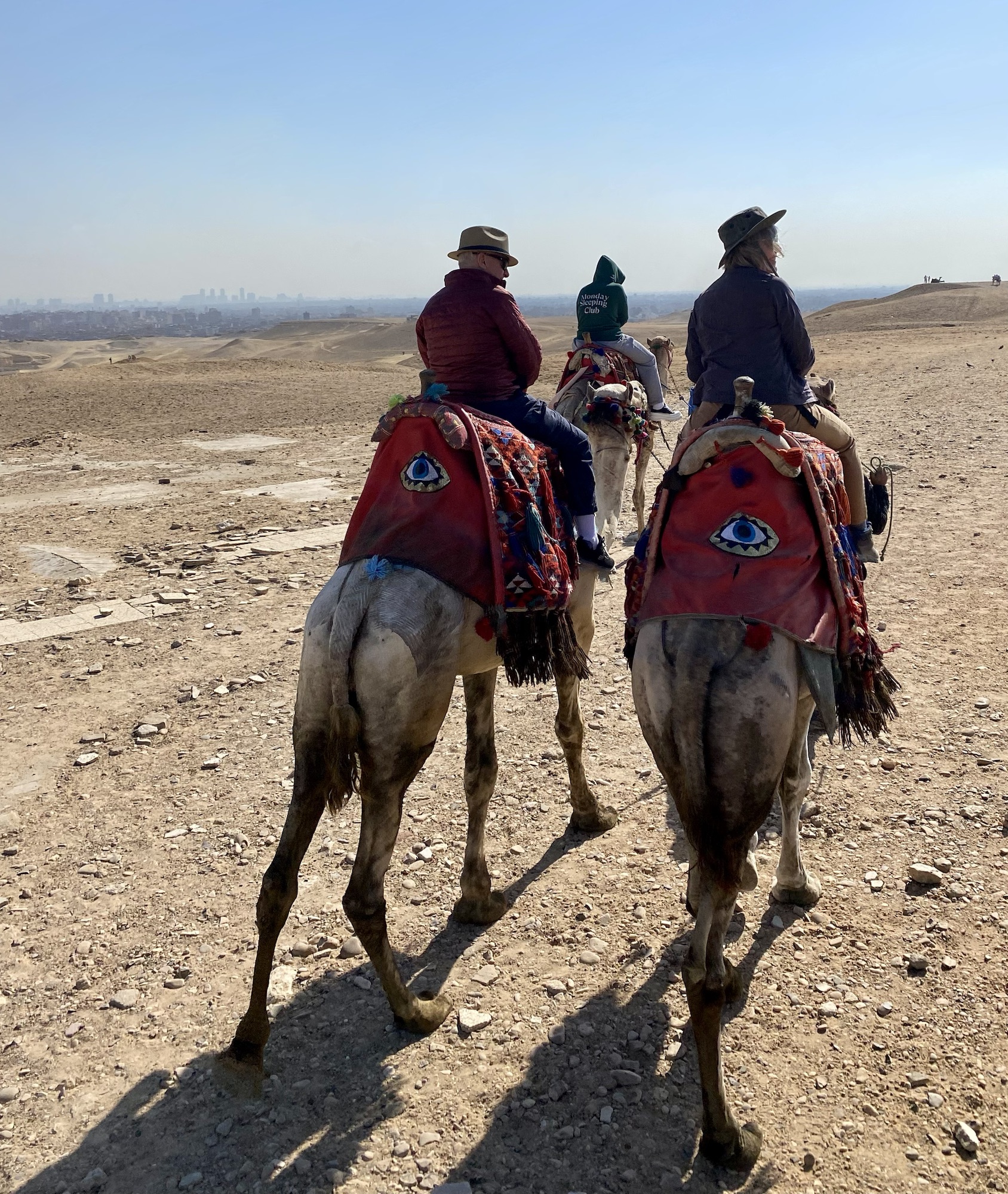 Located at the Panoramic View Point, we stopped to experience this iconic activity where caravans of camels sat on the ground, lazily munching fresh hay. Sam eliminated the hassle of negotiating a price and procured four camels for us. What an experience! Scenes of “Lawrence of Arabia” popped into my mind. I had always been enthralled by the expanse of the desert and riding a camel across it. Today, I was experiencing the sights, sounds, smells (camels are a bit stinky), and feel of this activity. The caretakers of the camels were considerate and cautious. The camels were content and offered an astonishingly smooth ride. For a half-hour, we rode in the desert, the pyramids of Giza standing majestically in the distance. For the most part, our camels were led on a rope by the camel driver, but at one point, the driver handed me the rope and I enthusiastically steered the camel on my own.