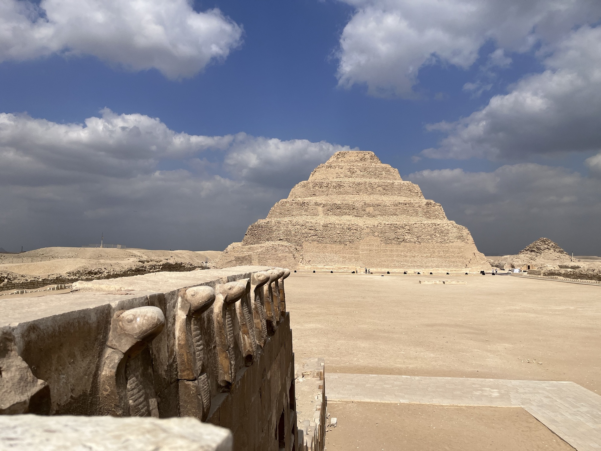After exploring further, we returned to the Step Pyramid, where we were greeted by the luminous blue skies and the golden stones. The Step Pyramid was constructed for King Djoser by his trusted advisor, Imhotep. Imhotep was an exceptional personality of his time, much like Leonardo DaVinci, who emerged thousands of years later. He not only designed the pyramid, which changed the way Egyptian Pharaohs built their funerary structures, but also served as the Pharaoh’s vizier. He was a physician, mathematician, astronomer, and writer. King Djoser was so grateful for Imhotep’s contributions that he had his name and accomplishments inscribed next to his for eternity.