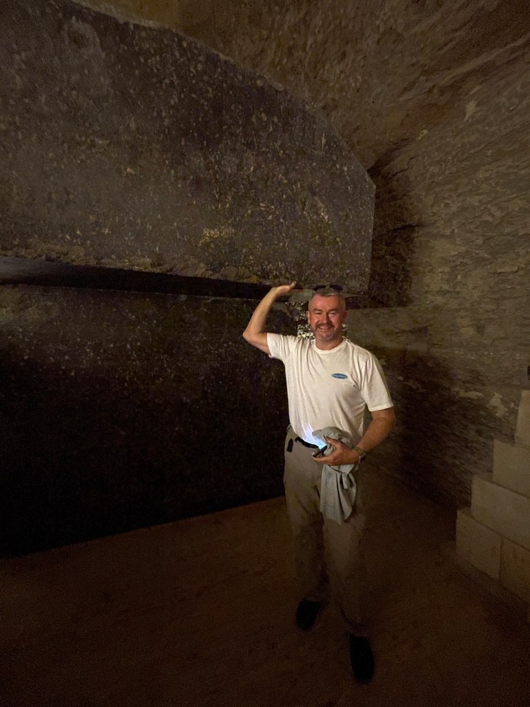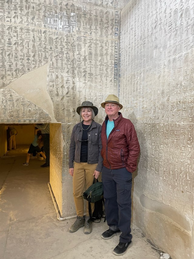 There were more pyramids to discover and soon we were on our way to the Saqqara Complex. My curiosity in Saqqara was prompted by a fascinating documentary titled “Secrets of the Saqqara Tomb” on Netflix. While digging at Egypt’s largest archeological site, archeologists discovered a well-preserved tomb. Man-size statues stood in niches along the walls. Vivid drawings decorated the tomb. Intrigued by this discovery, I learned that the Step Pyramid, Egypt’s oldest pyramid dating back to 2,670 BC, was at The Saqqara Necropolis. Saqqara and Dahshur had pyramids to explore, and Sam made sure our walk through these amazing outdoor museums would be memorable.
